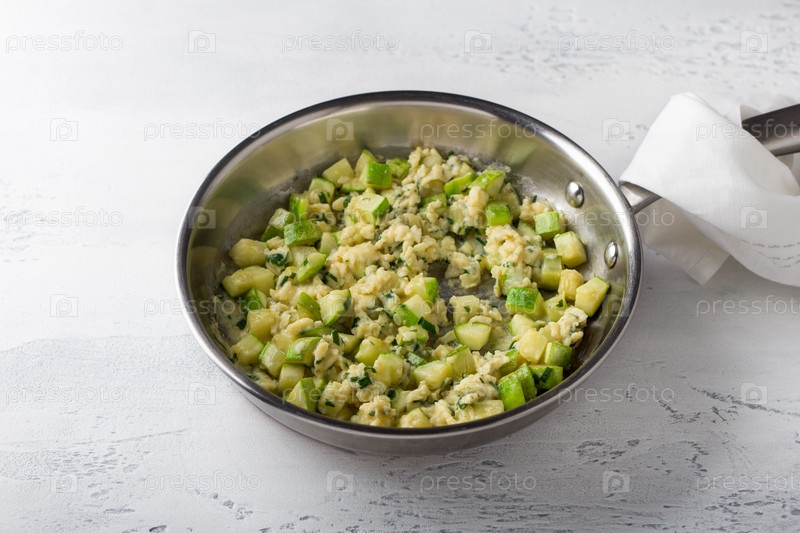 Жареные цуккини с петрушкой, залитые яйцами, на сковороде на светло-сером столе. Готовим вкусный омлет
