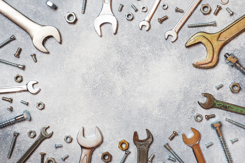 Гаечные ключи, инструменты, болты и гайки на сером бетонном фоне с местом для копирования