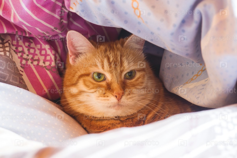 Рыжий кот годами лежит на кровати в одеяле. Уютный дом и концепция отдыха