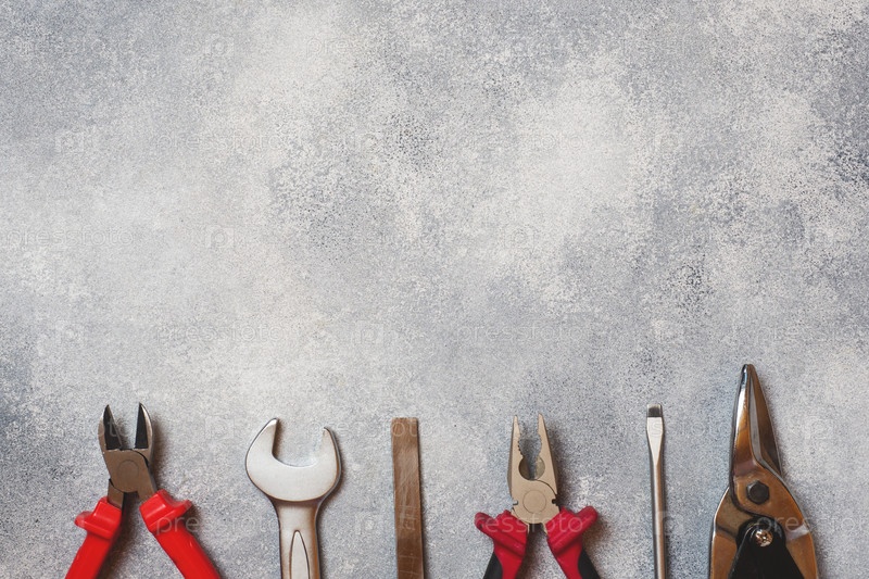 Плоскогубцы, отвертки и комбинация гаечного ключа на сером бетонном фоне с местом для копирования. Профессиональные эргономичные инструменты для ремонта