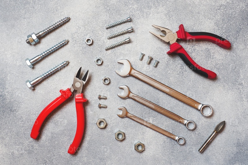 Плоскогубцы, отвертки и комбинация гаечного ключа на сером бетонном фоне с местом для копирования. Профессиональные эргономичные инструменты для ремонта