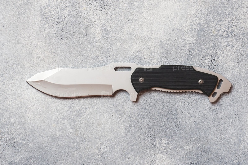 Стальной нож для охоты и туризма на сером бетонном фоне