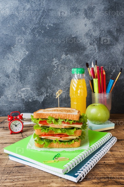 Здоровый обед для школы с сэндвичем, свежим яблоком и апельсиновым соком. Ассорти из красочных школьных принадлежностей. Копировальное пространство