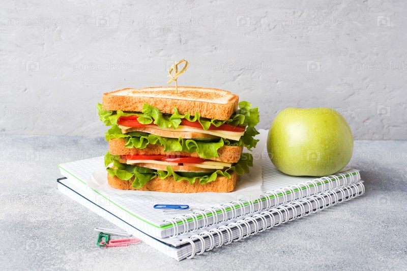 Здоровый обед для школы с сэндвичем, свежим яблоком. Ассорти из красочных школьных принадлежностей. Копировать пространство