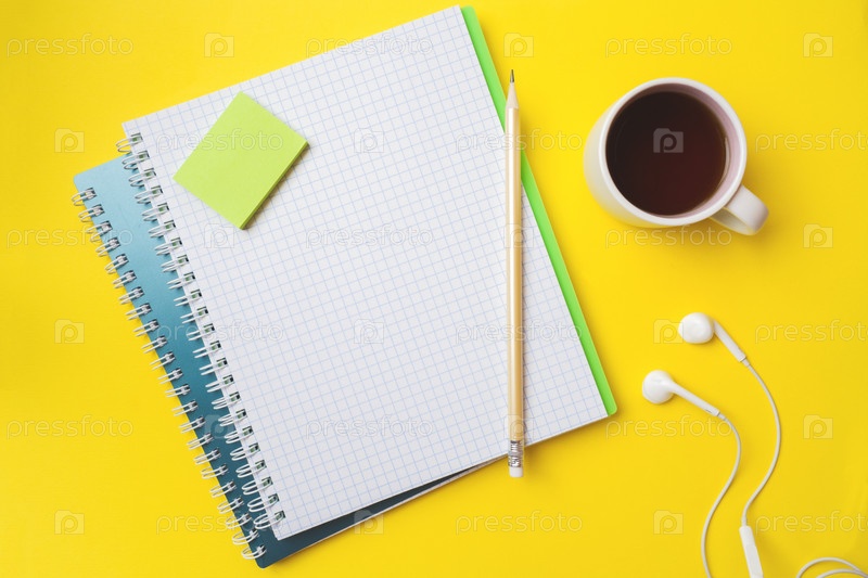Чистый белый блокнот и карандаш Чашка кофе с местом для текста на желтом фоне стола для презентации, писателя или школьного образования, блогера, романа и концепции истории бренда