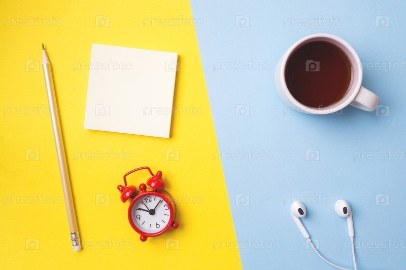 Наклейки канцелярские принадлежности, чашка кофе и часы на желто-синем столе с копией пространства. Концепция школьного образования, офиса и фриланса