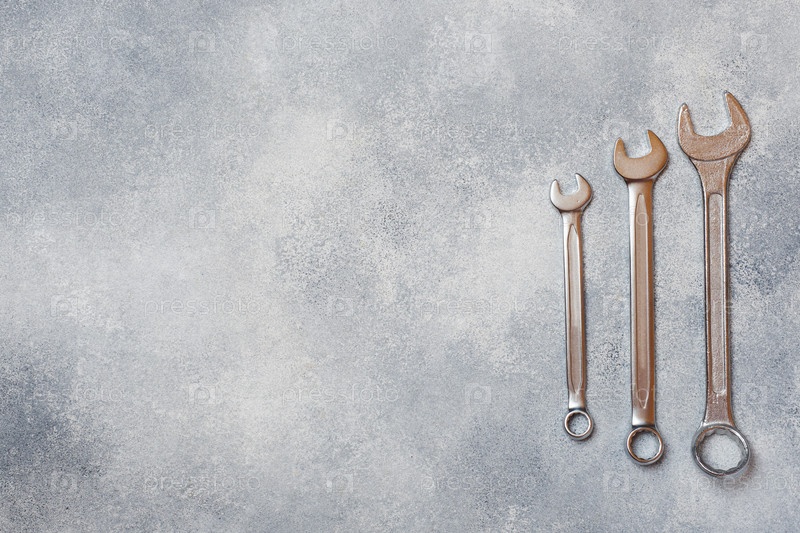 Гаечные ключи, инструменты на сером бетонном фоне с местом для копирования