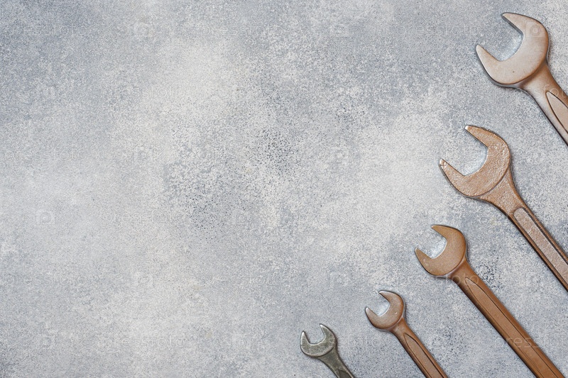 Гаечные ключи, инструменты на сером бетонном фоне с местом для копирования