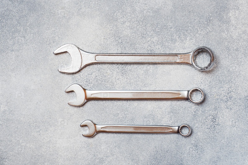 Гаечные ключи, инструменты на сером бетонном фоне с местом для копирования