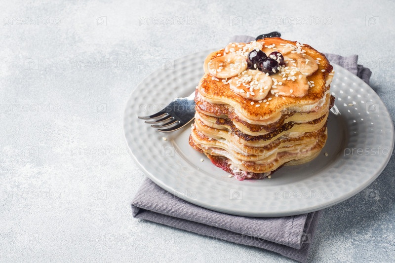 Блинный торт с бананами и ягодным сиропом, выборочный фокус, серый фон