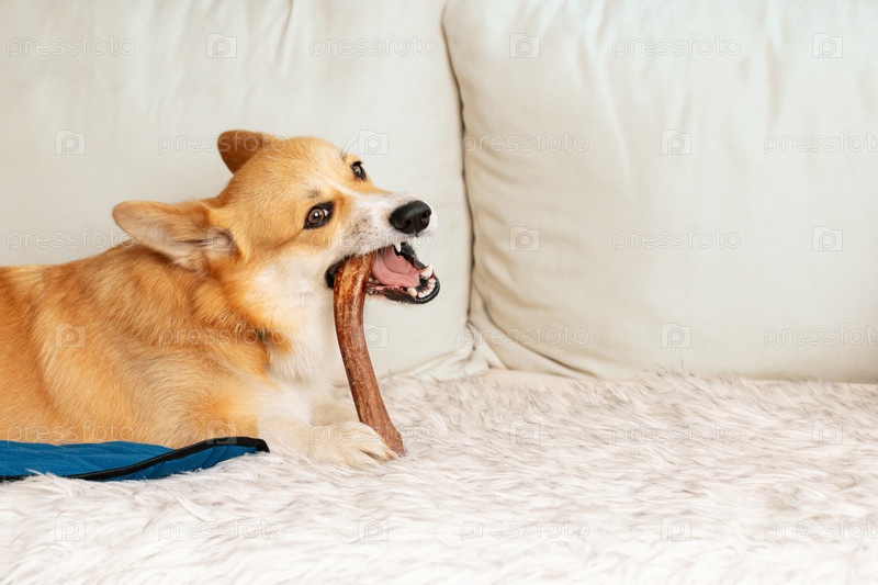 Счастливая собака грызет лакомство из рогов оленя на диване