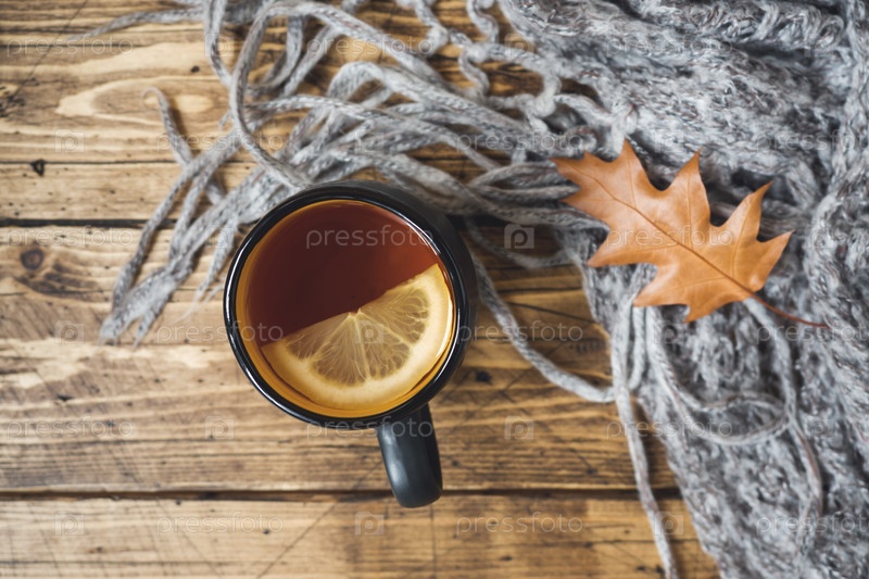 Осенняя концепция. Чашка чая, теплое одеяло и желтые листья на деревянном столе