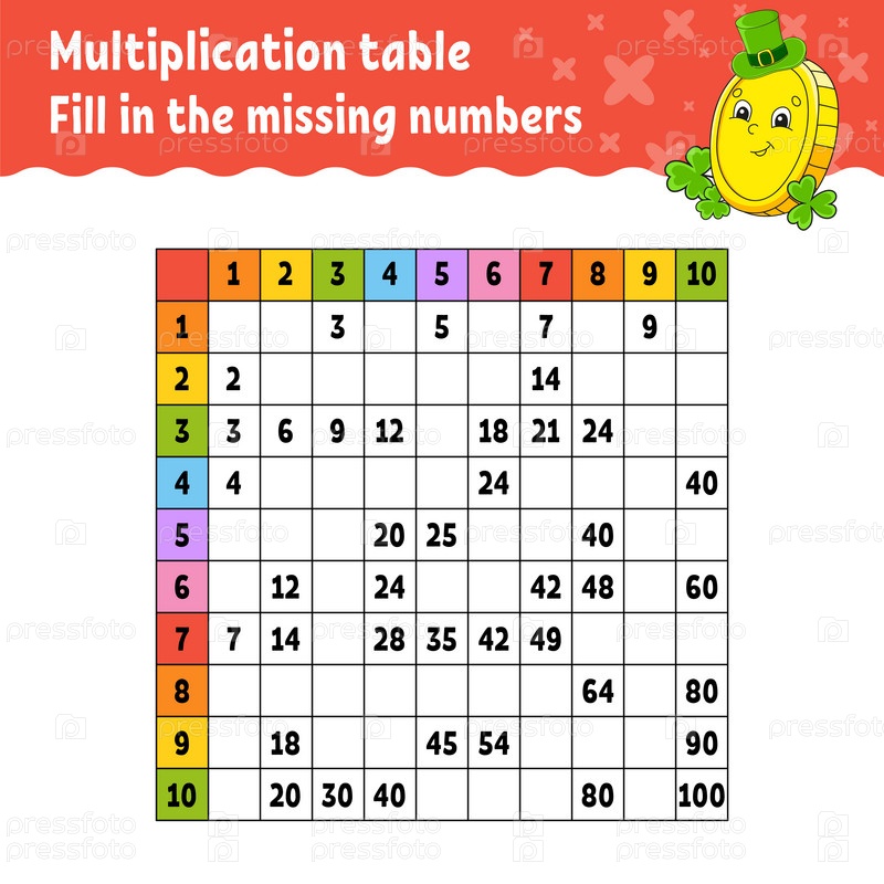 Вставьте пропущенные числа. Изучение таблицы умножения. Практика письма. Образовательный развивающий рабочий лист. Цветная страница с заданиями. Игра для детей. Изолированная векторная иллюстрация в мультяшном стиле