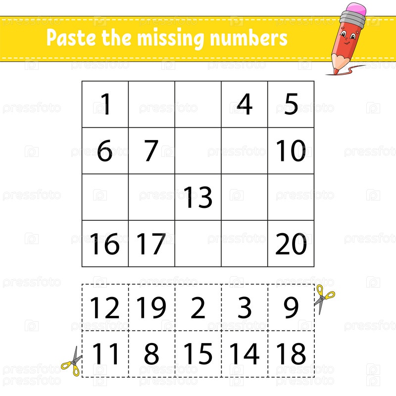Вставьте пропущенные цифры от 1 до 20. Игра для детей. Практика письма. Изучение цифр для детей. Образовательный развивающий рабочий лист. Страница с заданиями. Изолированная векторная иллюстрация в милом мультяшном стиле