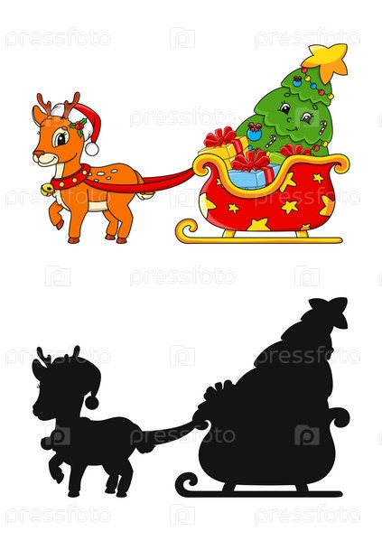 Зимний олень с санями Санта-Клауса с подарком. Черный силуэт. Векторная иллюстрация, изолированная на белом фоне. Элемент дизайна. Шаблон для вашего дизайна, книги, наклейки, плакаты, открытки