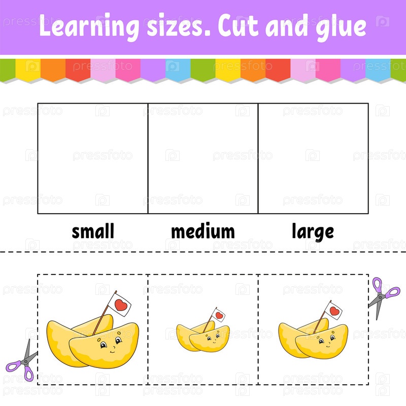 Изучаем размеры. Вырезаем и склеиваем. Легкий уровень. Рабочий лист с цветной активностью. Игра для детей. Персонаж мультфильма. Векторная иллюстрация