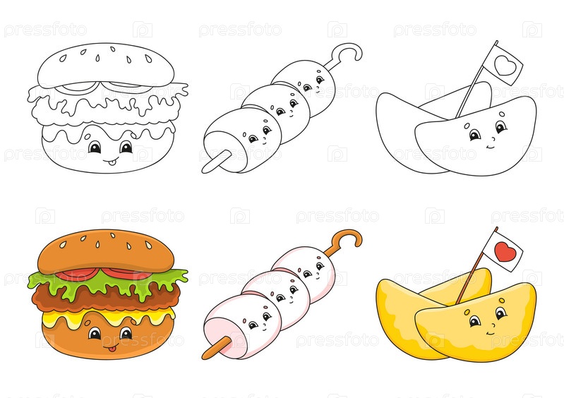 Набор раскрасок для детей. Милые персонажи мультфильмов. Черная обводка. С образцом. Векторная иллюстрация. Тема барбекю