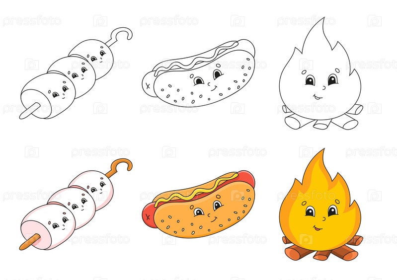 Набор раскрасок для детей. Милые персонажи мультфильмов. Черная обводка. С образцом. Векторная иллюстрация. Тема барбекю