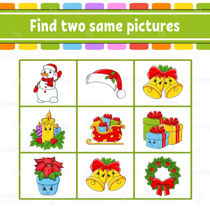 Найдите две одинаковые картинки. Задание для детей. Образовательный развивающий рабочий лист. Страница с заданиями. Цветная игра для детей. Забавный персонаж. Изолированная векторная иллюстрация. Мультяшный стиль. Рождественская тема