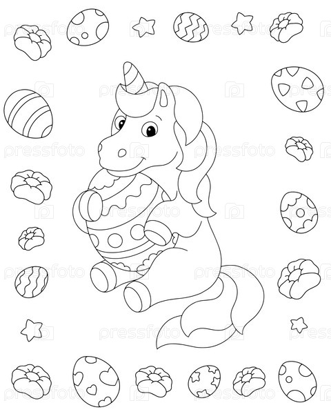 Единорог и пасхальное яйцо. Страница раскраски для детей. Персонаж в мультяшном стиле. Векторная иллюстрация на белом фоне