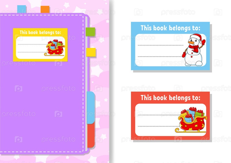 Наклейки на этикетки книг для детей. Прямоугольная форма. Персонаж мультфильма. Для дневника, блокнота, книги. Изолированные на белом фоне. Векторная иллюстрация