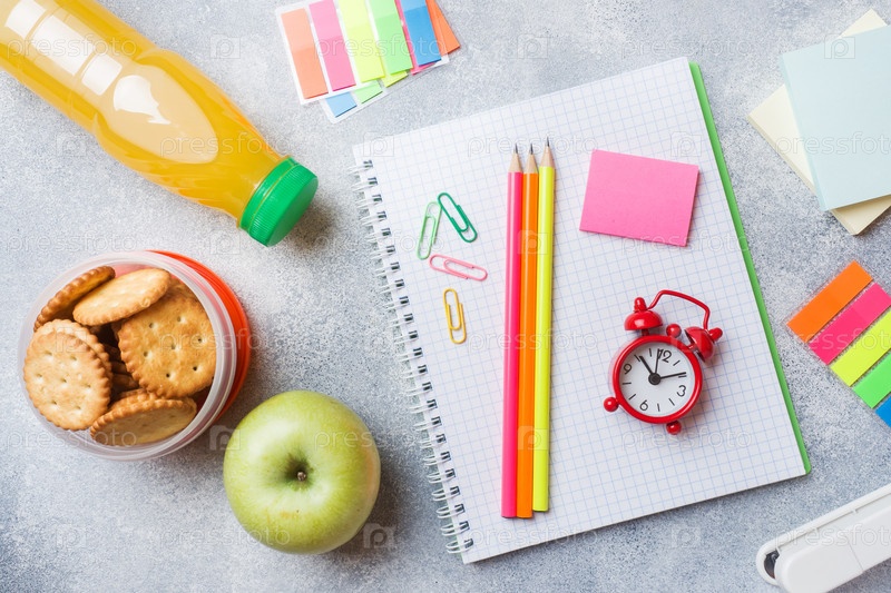 Школьные принадлежности и крекеры на завтрак, апельсиновый сок и свежее яблоко на сером столе с копировальным пространством. концептуальная школа