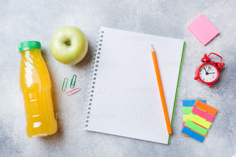 Школьные принадлежности и крекеры на завтрак, апельсиновый сок и свежее яблоко на сером столе с копировальным пространством. концептуальная школа