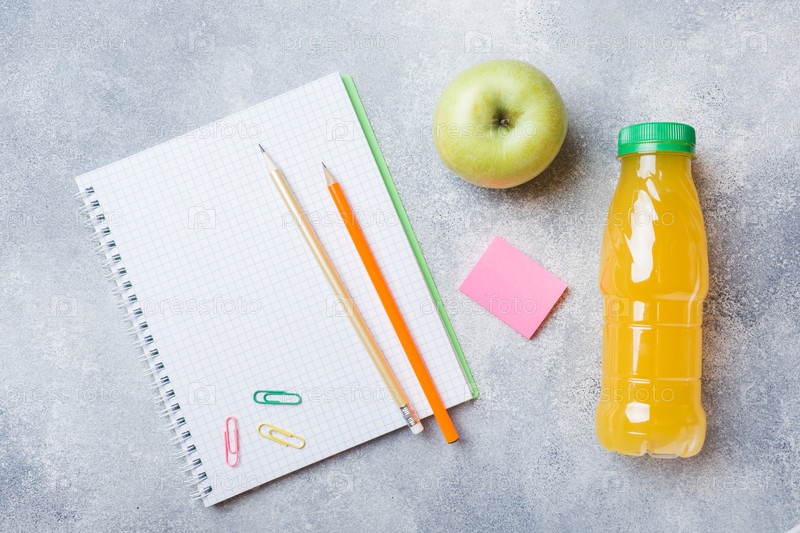 Школьные принадлежности и крекеры на завтрак, апельсиновый сок и свежее яблоко на сером столе с копировальным пространством. концептуальная школа