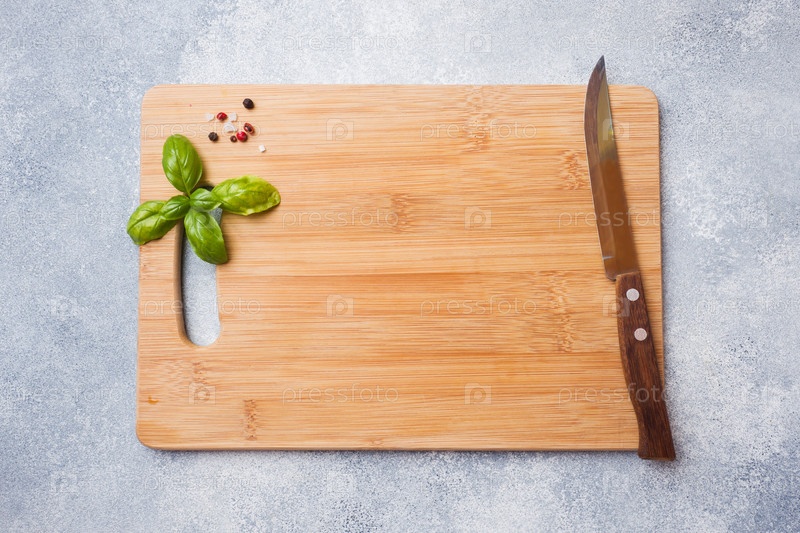 Пустая деревянная разделочная доска на кухонном столе. Вид сверху, копировальное пространство