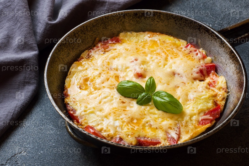 Омлет, яичница с помидорами и сыром на сковороде на темном столе