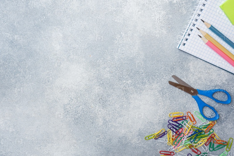 Школьные принадлежности, тетради, карандаши на сером фоне с местом для копирования
