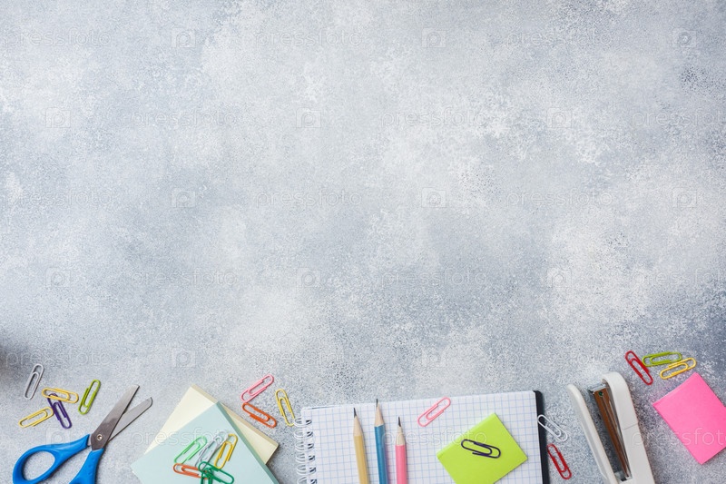 Школьные принадлежности, тетради, карандаши на сером фоне с местом для копирования