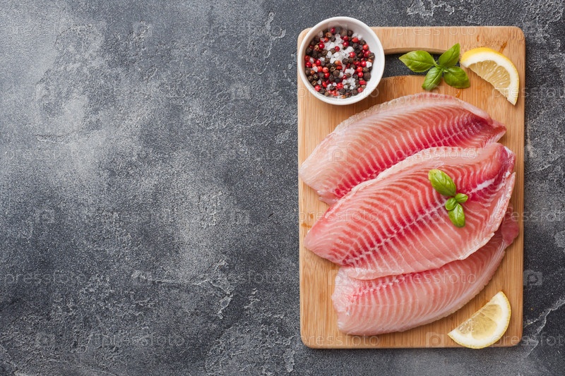 Сырое филе рыбы тилапии на разделочной доске с лимоном и специями. Темный стол с копировальным пространством