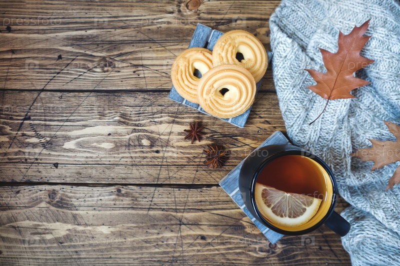 Осенний натюрморт с чашкой чая, печеньем, свитером и листьями на деревянном фоне. концепция уютной осени, осенний сезон