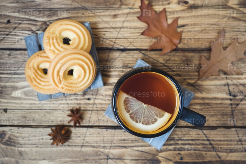 Осенний натюрморт с чашкой чая, печеньем, свитером и листьями на деревянном фоне. концепция уютной осени, осенний сезон