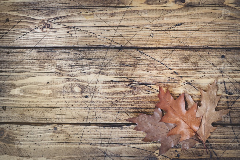 Осенний натюрморт. Сухие дубовые листья на деревянной доске. Вид сверху, винтажный стиль. Копировать пространство