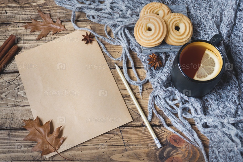 Осенний натюрморт с чашкой чая, печеньем, свитером и листьями на деревянном фоне. концепция уютной осени, осенний сезон Форма для текста