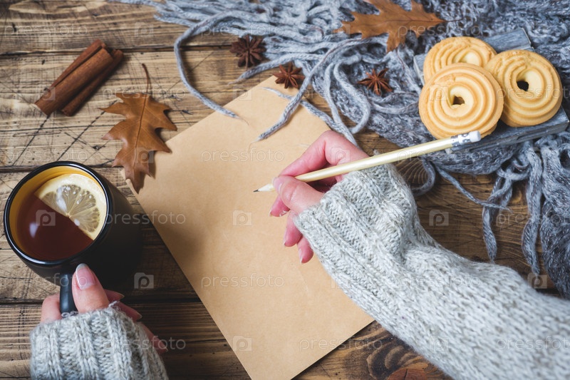 Осенний натюрморт с чашкой чая, печеньем, свитером и листьями на деревянном фоне. концепция уютной осени, Форма для текста. Женская рука держит ручку