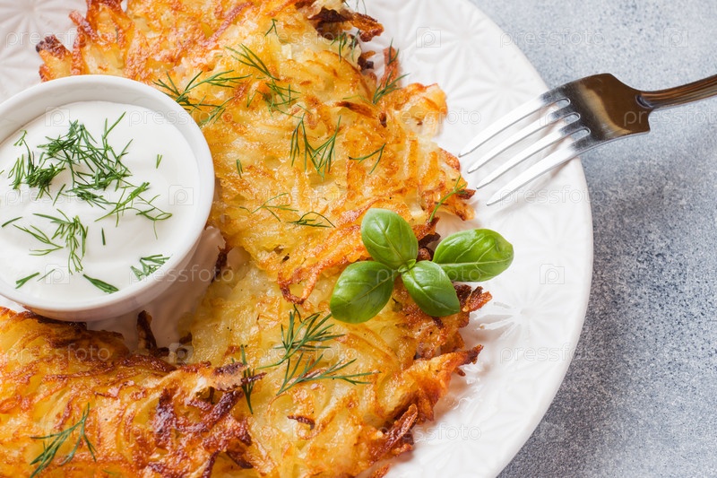 Жареные булочки из жареного картофеля на тарелке с соусом.Традиционные блины boxty raggmunk