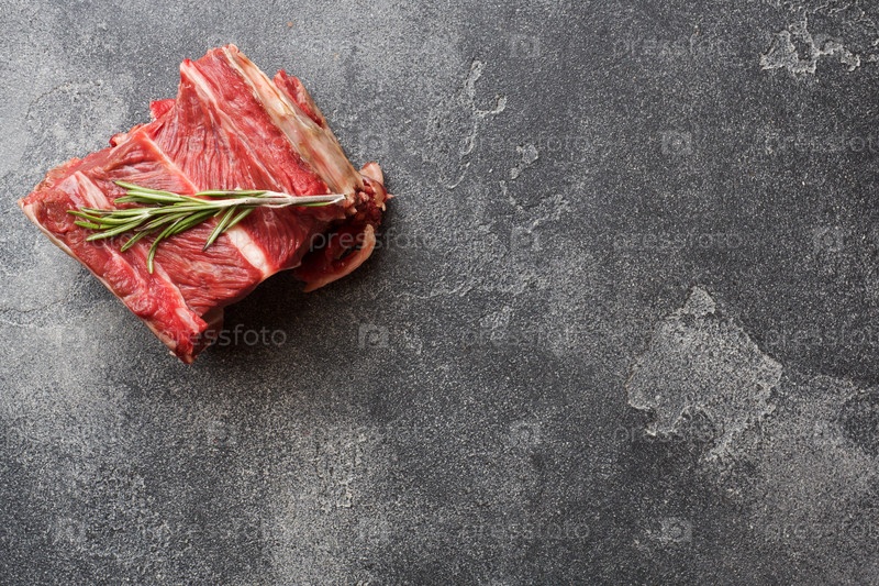 Свежий сырой кусок говяжьего ребра с мясом на темном бетонном фоне с местом для копирования