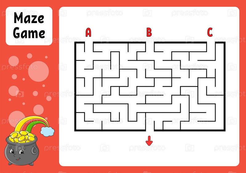 Прямоугольный лабиринт. Игра для детей. Три входа, один выход. Образовательный рабочий лист. Головоломка для детей. Загадка лабиринта. Цветная векторная иллюстрация. Найдите правильный путь. персонаж мультфильма