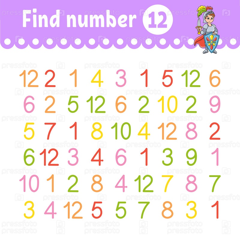 Найдите число. Образовательный развивающий рабочий лист. Страница с заданиями с картинками. Игра для детей. Забавный персонаж. Мультяшный стиль. Векторная иллюстрация