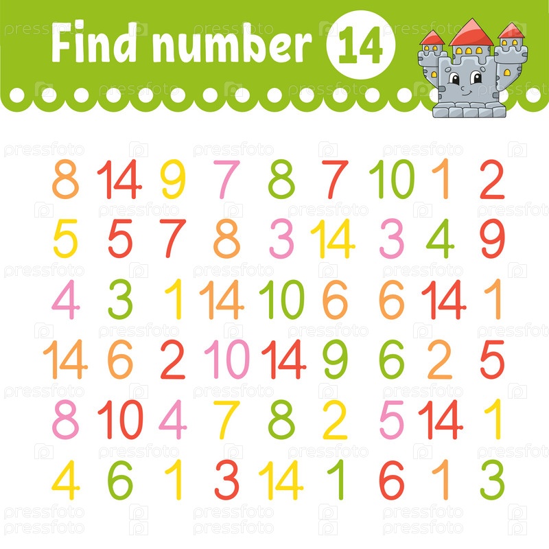 Найдите число. Образовательный развивающий рабочий лист. Страница с заданиями с картинками. Игра для детей. Забавный персонаж. Мультяшный стиль. Векторная иллюстрация