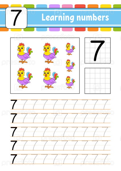 Обведи и напиши цифры. Практика письма. Изучение цифр для детей. Развивающий рабочий лист. Страница с заданиями. Векторная иллюстрация