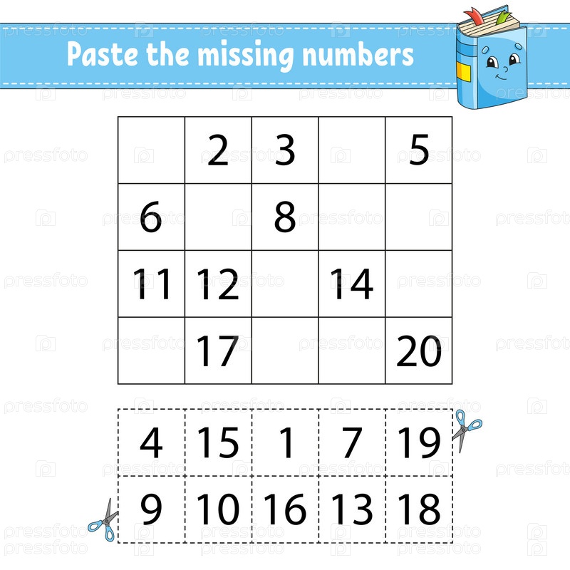 Вставьте пропущенные цифры от 1 до 20. Игра для детей. Практика письма. Изучение цифр для детей. Образовательный развивающий рабочий лист. Страница с заданиями. Изолированная векторная иллюстрация в милом мультяшном стиле