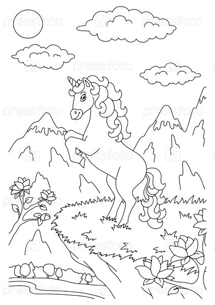 Милый единорог. Волшебная сказочная лошадь. Страница раскраски для детей. Мультяшный стиль. Векторная иллюстрация на белом фоне