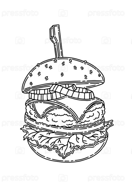 Аппетитный гамбургер. Черный силуэт. Элемент дизайна. Нарисованный от руки эскиз. Винтажный стиль. Векторная иллюстрация, изолированная на белом фоне