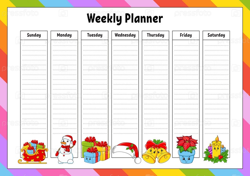 Планировщик на неделю. Яркий красочный пустой шаблон для печати. Рождественская тема. Векторная иллюстрация