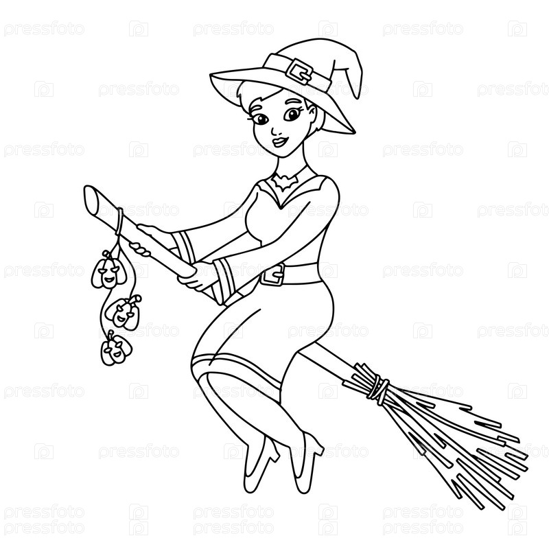 Красивая ведьма летит на метле. Страница раскраски для детей. Персонаж в мультяшном стиле. Векторная иллюстрация на белом фоне. Тема Хэллоуина