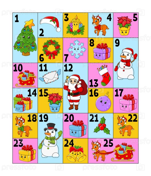 Рождественский адвент-календарь с милыми персонажами. Санта-Клаус, олень, снеговик, елка, снежинка, подарок, безделушка, носок. Мультяшный стиль. С цифрами от 1 до 25. Векторная иллюстрация. Подготовка к празднику